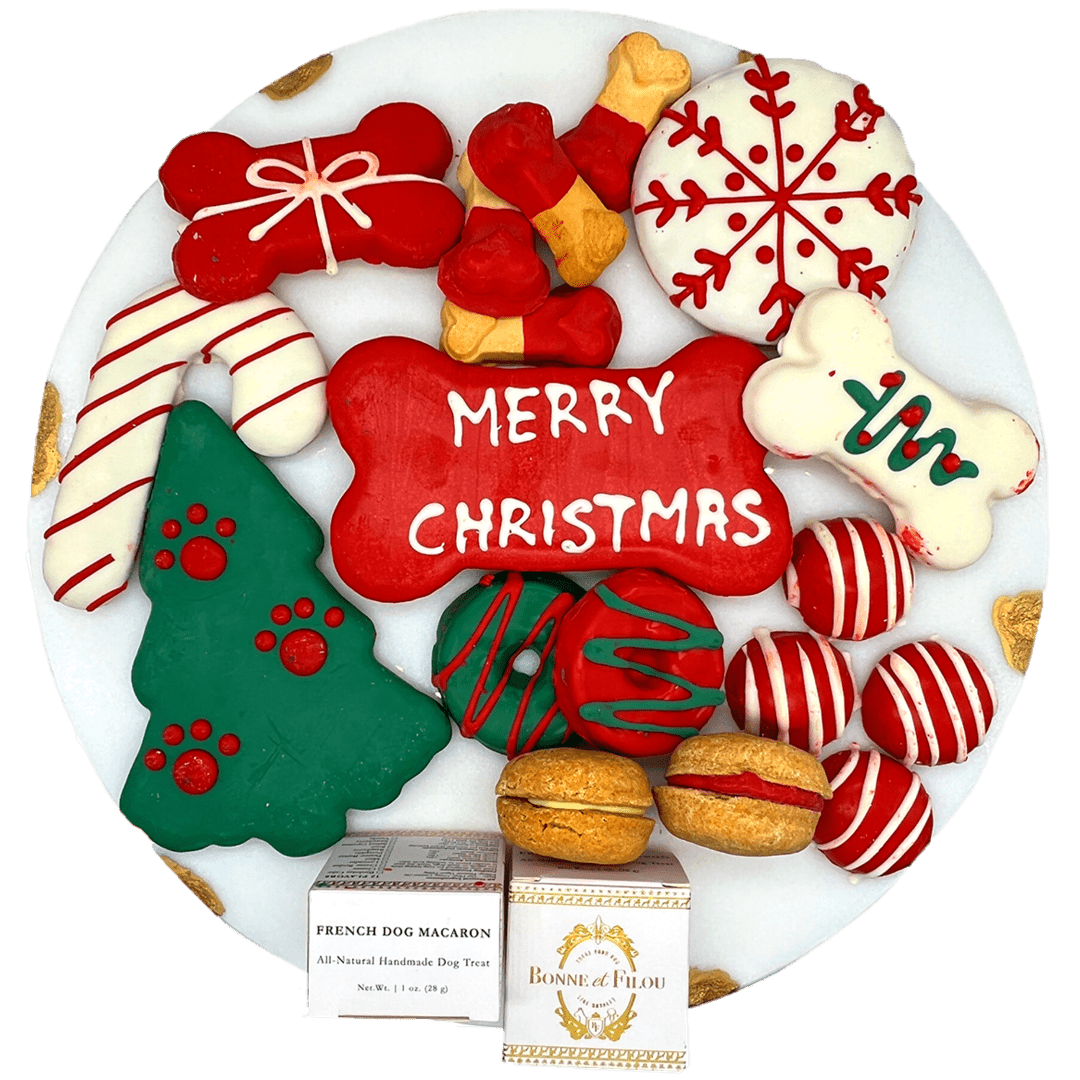 Santa Paws is comin’ to town with a special delivery - our exclusive Christmas Box brimming with 18 decadent handmade holiday themed treats (macarons, bones, snowflakes, truffles, and trees) to absolutely spoil your pup!