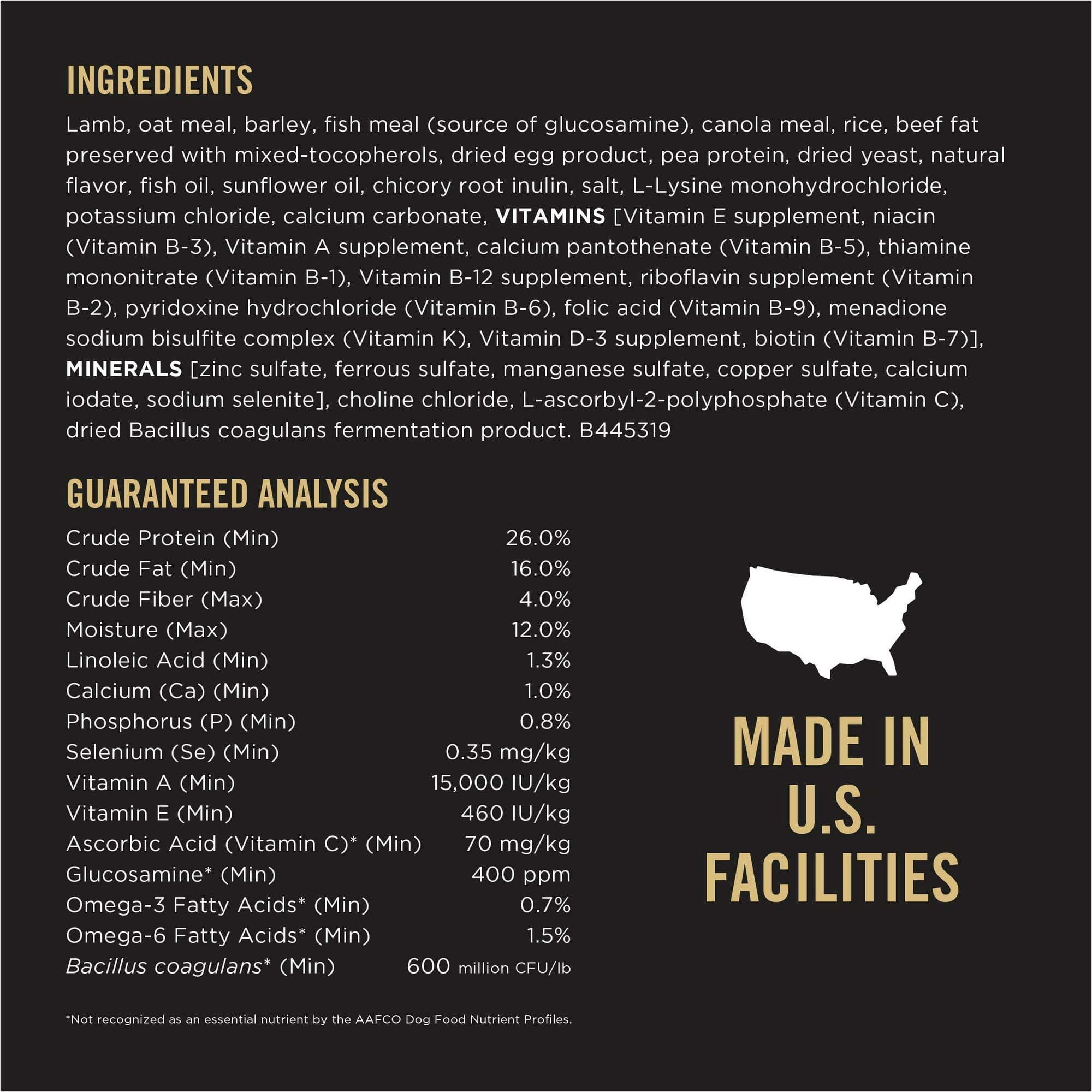 Purina Pro Plan Sensitive Skin and Stomach for Adult Dogs Lamb Oat Meal, Keep your dog's sensitive skin and stomach protected while meeting his nutritional needs with Purina Pro Plan Brand Dog Food Sensitive Skin Stomach Lamb Oat Meal Formula adult dry dog food. This adult dog food for sensitive stomachs is made without corn, wheat, soy or poultry by-product meal, giving your canine companion the nutritious ingredients you expect from a super-premium dog food. Omega-6 fatty acids and vitamin A nourish your dog's skin and promote his healthy coat so he can look his very best, and omega-3 fatty acids for healthy joints and mobility help to support his active lifestyle.