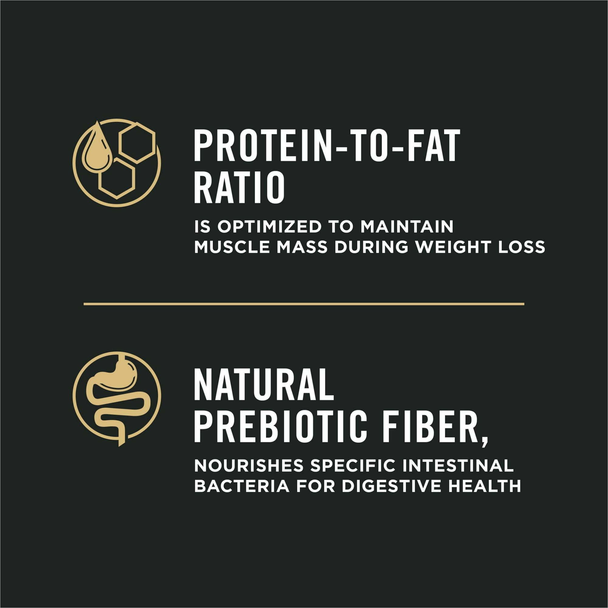 Purina Pro Plan Weight Management for Adult Dogs, Care for your large dog's nutritional needs with Purina Pro Plan Dog Food Weight Management Large Breed Chicken Rice Formula adult dry dog food. Each serving contains high-quality protein, including chicken as the first ingredient, and this healthy weight dog food features 27 percent protein and 9.5 percent fat to help him maintain an ideal weight and body condition. Natural prebiotic fiber, sourced from wheat bran, helps promote your canine companion's digestive health. This weight management dog food formula contains 15 percent less fat than Pro Plan ESSENTIALS Shredded Blend Chicken Rice Formula for Adult Dogs.